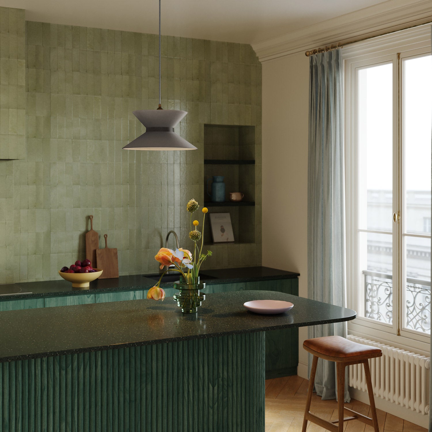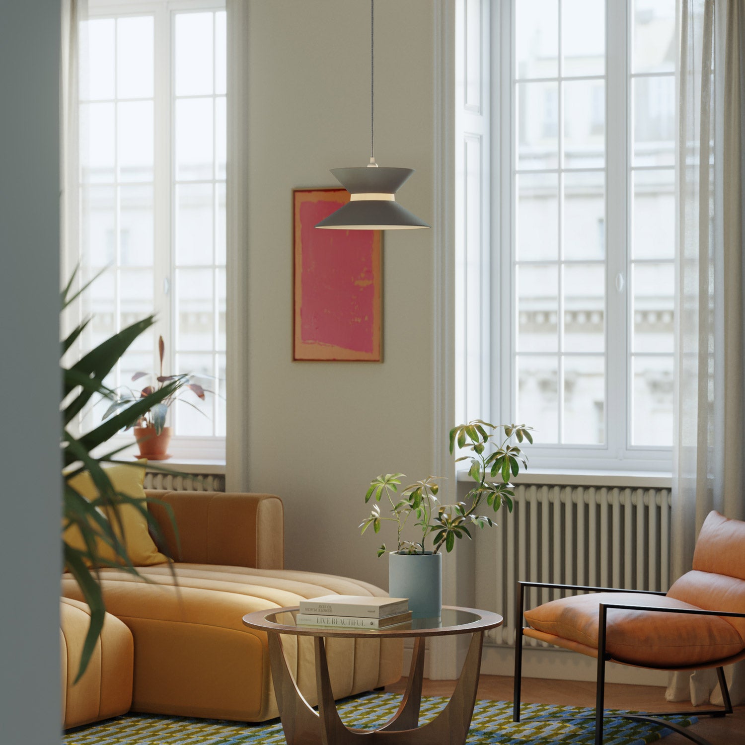 Sa forme particulière diffuse la lumière vers le haut et vers le bas, créant un éclairage chaleureux et homogène. La teinte gris foncé rend l’atmosphère enveloppante et sophistiquée.